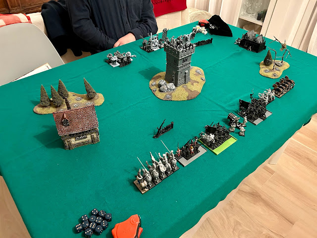 Ogres win the throw for the tower, so they start with a core unit inside it. Grimbeorn puts on the battlefield a Bruiser with two hand weapons (General), another Bruiser as BSB, 6 Ogres, 6 Ironguts and 5 Leadbelchers. BSB and core Ogres are currently garrisoning the tower.